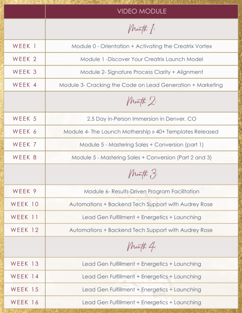 I mean it love, the entire Creatrix Launch Model and of the systems, strategies, and templates I used to grow my business from $0 to over $500k/year consistently. I use all organic traffic, a simple business model, and being in the highest expression of my soul’s purpose. You’ll receive the whole darn thang. A formula that you can rinse, wash, and repeat for years to come, so that you can eliminate the guesswork and make the kind of money that will change your life.